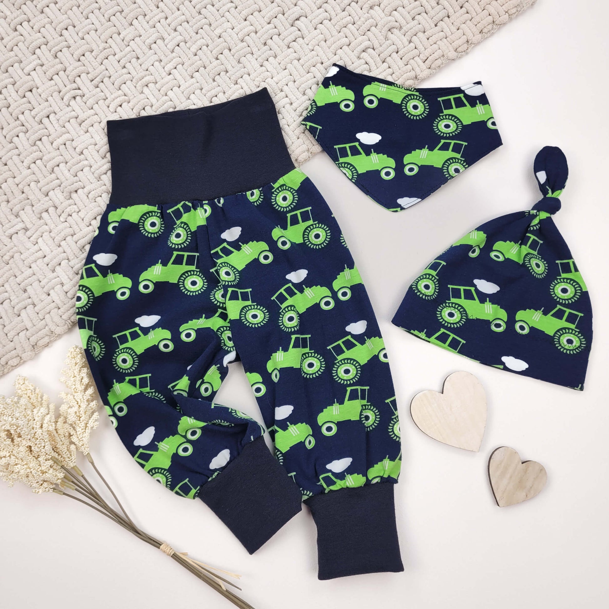 Besteht aus einer Pumphose, einer Knotenmütze und einem Halstuch aus Jersey.