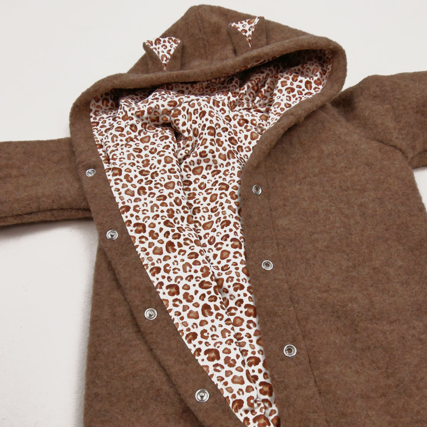 Mit dem Konfigurator gestaltest du den Overall so, wie er euch am besten gefällt: Wähle die Wollfleecefarbe, den Motivjersey für das Futter, Druckknöpfe oder Reißverschluss, extralange Mitwachsbündchen, einen zusätzlichen Zwickel für mehr Platz (ideal auch für Stoffwindelpopos) und – wenn du magst – niedliche Bärchenohren an der Kapuze. So entsteht ein ganz persönliches Lieblingsstück, das perfekt passt.