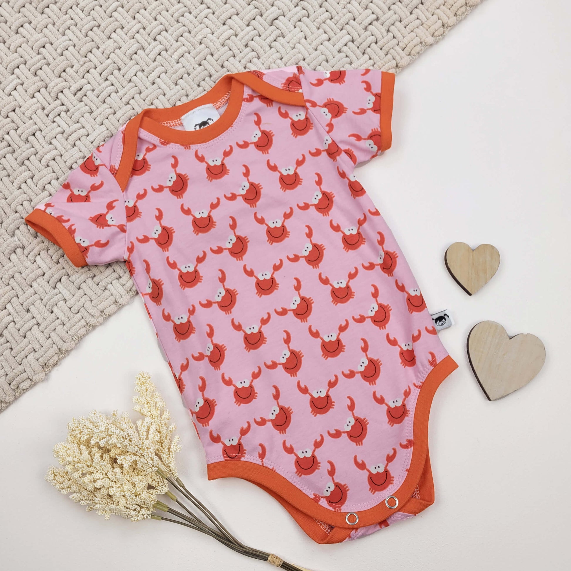 Farbenfroher Kurzarm-Body aus weichem Jersey mit fröhlichem Krabbenmotiv. Der amerikanische Ausschnitt erleichtert das An- und Ausziehen im Alltag.