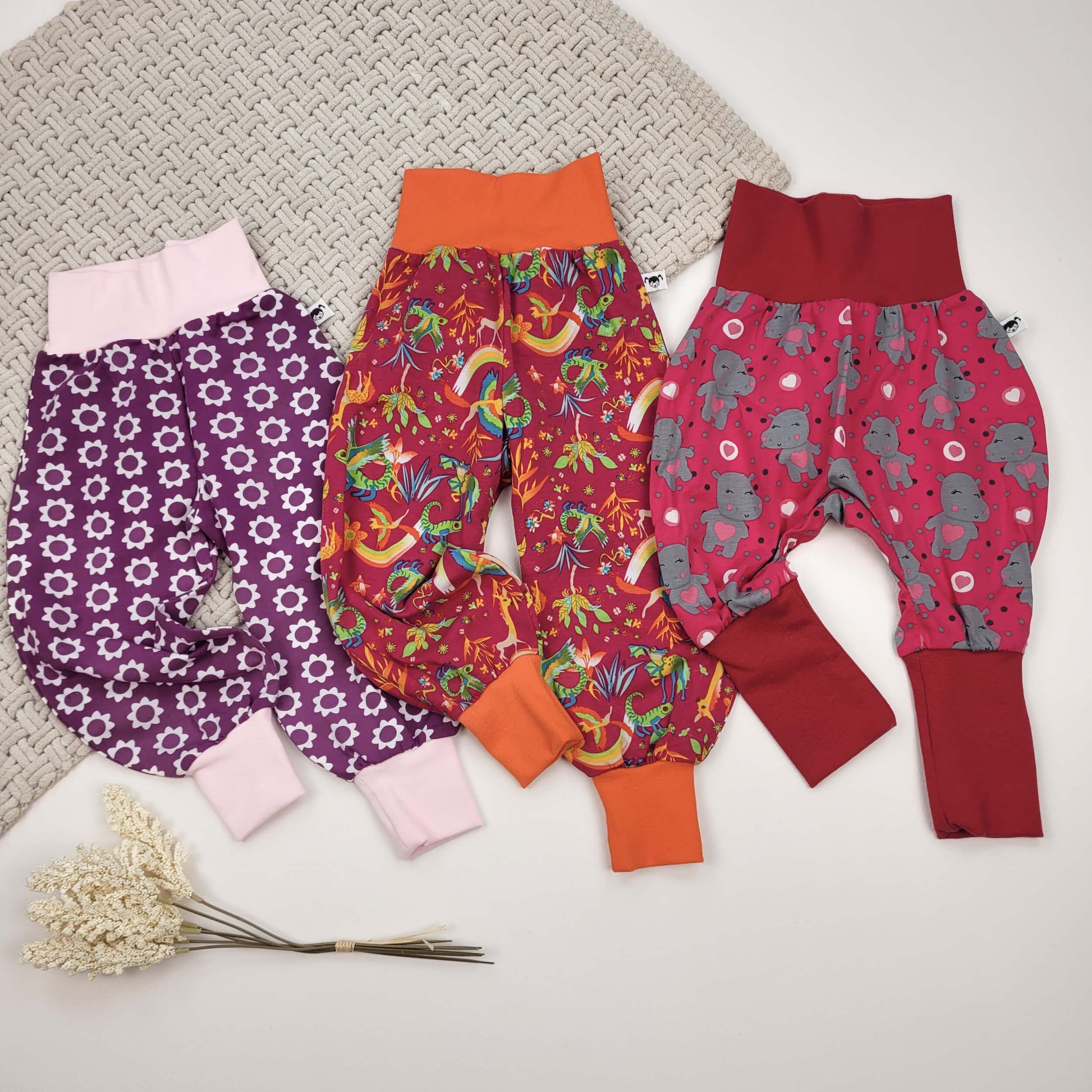 Das Set besteht aus zwei Pumphosen, die recht lange mitwachsen, sowie einer Knickerbockerhose, die etwas kürzer geschnitten ist.