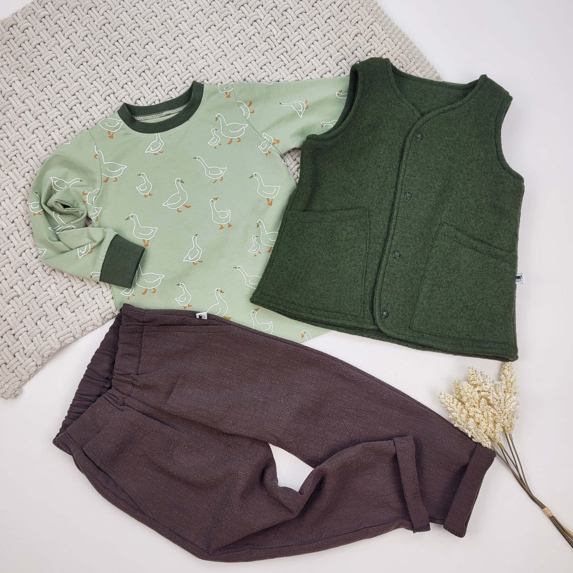 Set Gänse aus Langarmshirt, Leinenhose und Merino-Walkweste für Kinder