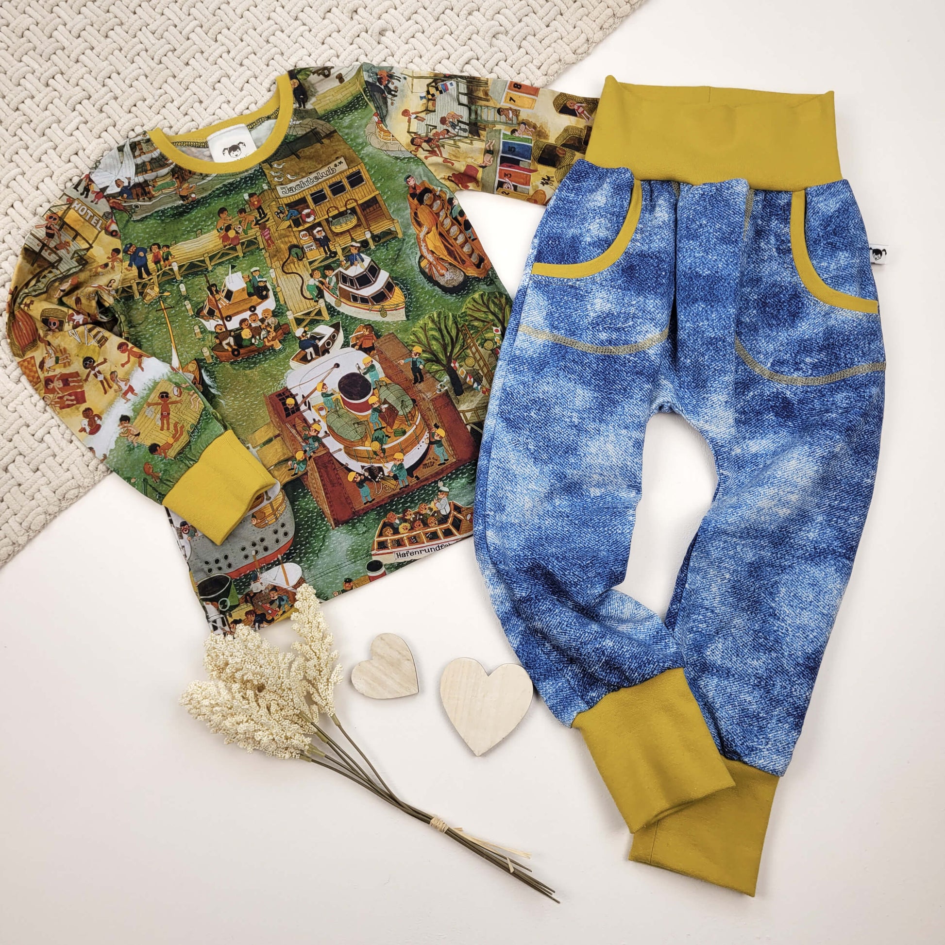 Dieses Set besteht aus einem Langarmshirt aus Wimmelbildstoff (Jersey) und einer Baggy Joggers aus French Terry im Jeans-Look.