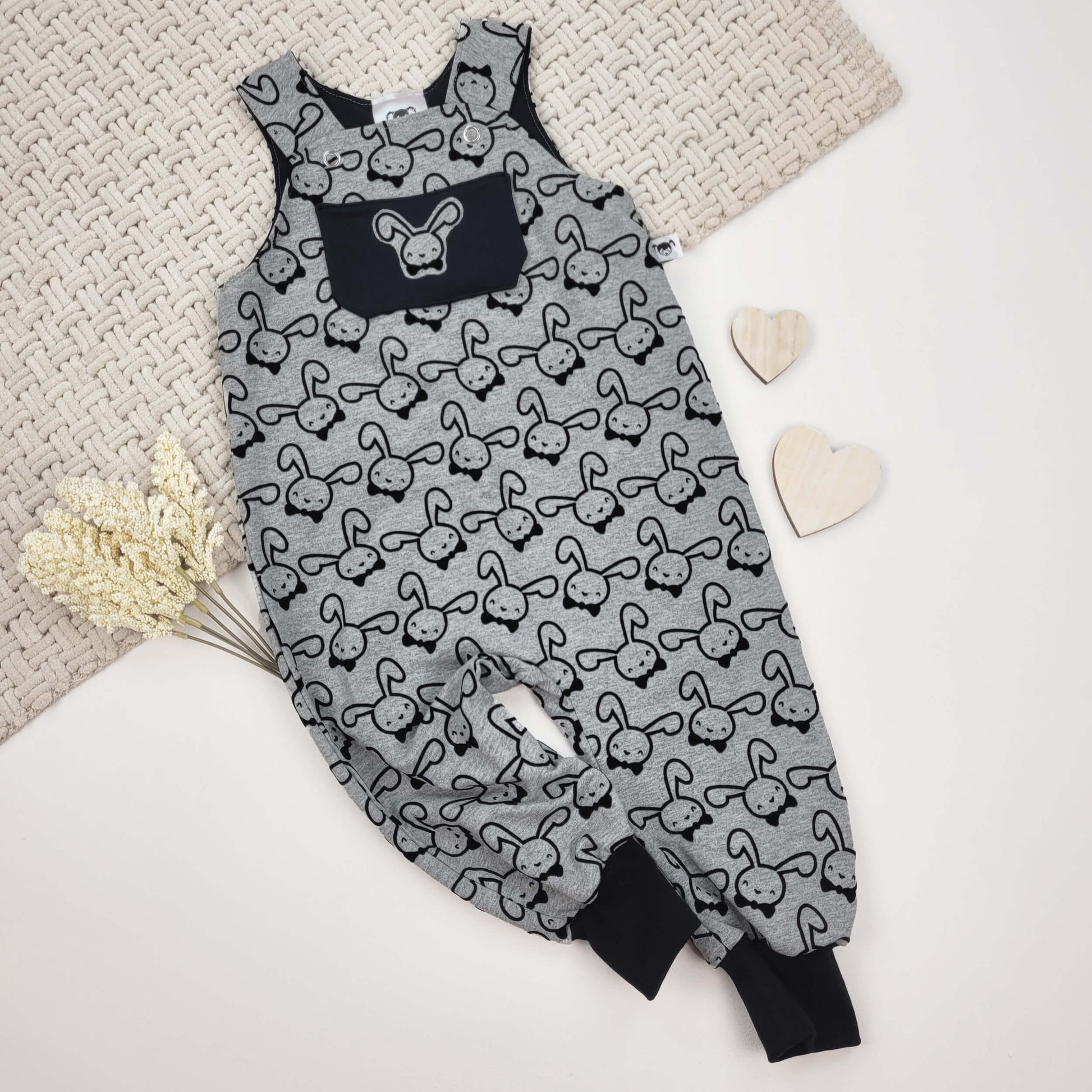 Vorne ist eine aufgenähte Tasche mit appliziertem Hasen angebracht.