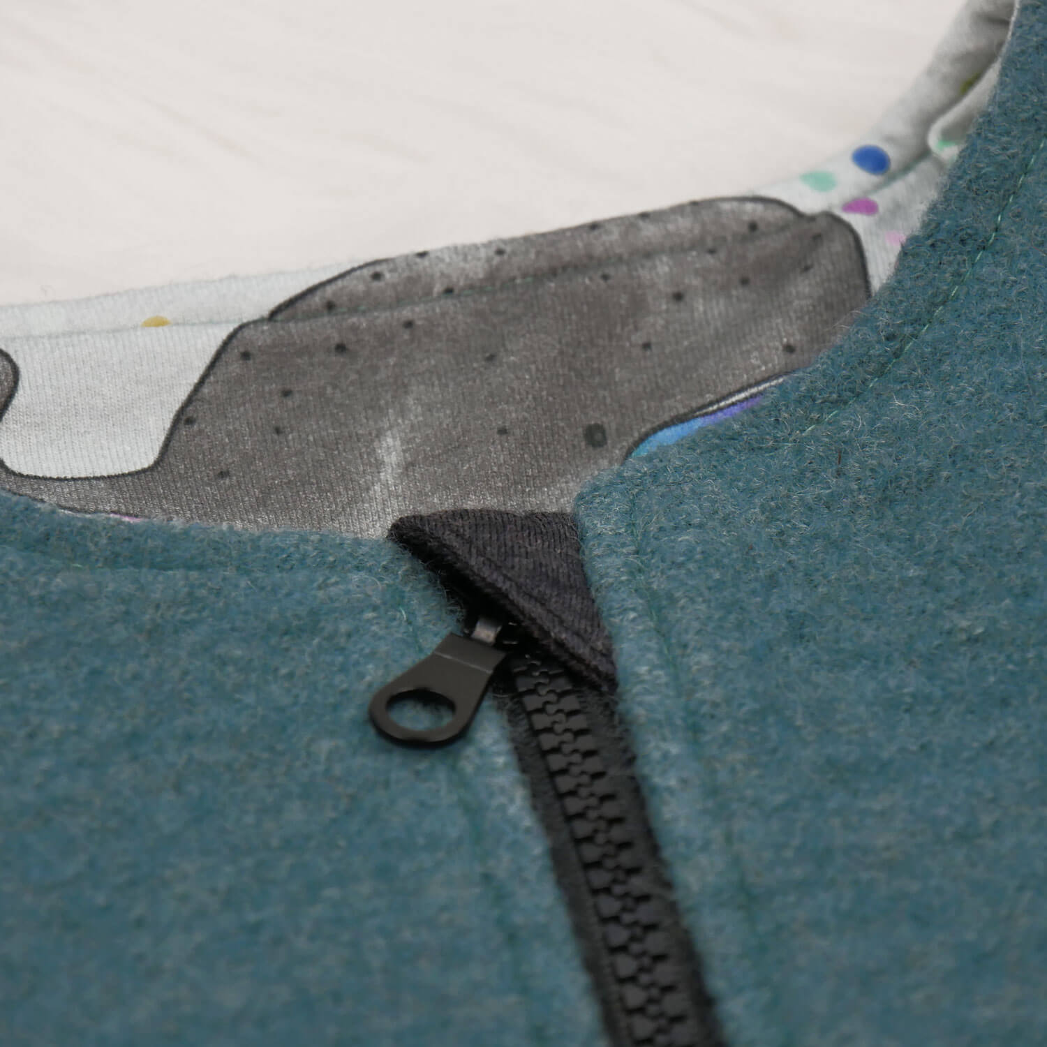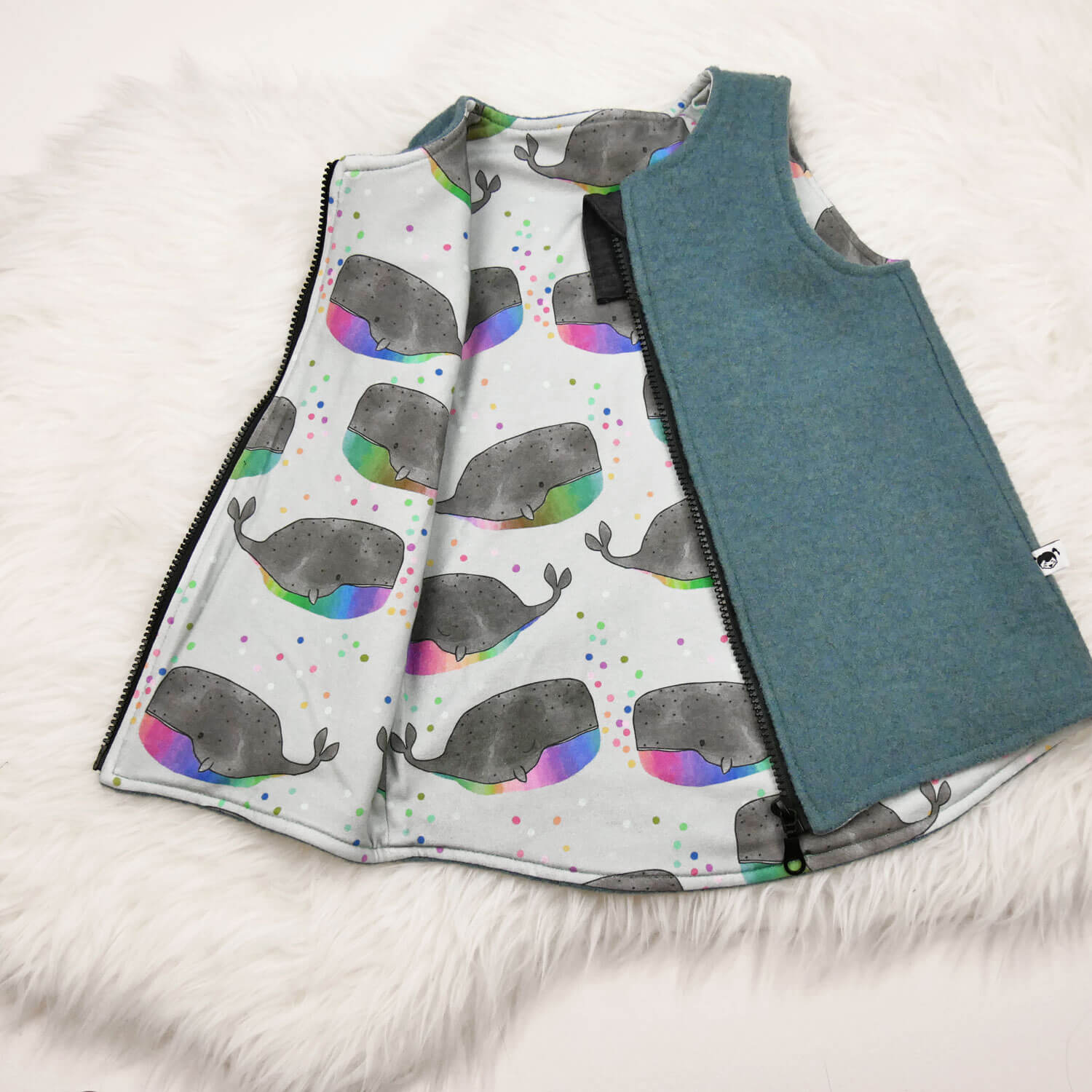 Diese besondere Weste ist ein echtes Unikat. Außen aus hochwertigem Wollwalk gefertigt, innen mit weichem Bio-Baumwolljersey gefüttert, begleitet sie dein Kind zuverlässig durch den Alltag. Warm, bequem und zugleich leicht – ideal für die Übergangszeit oder als zusätzliche Schicht an kühleren Tagen.